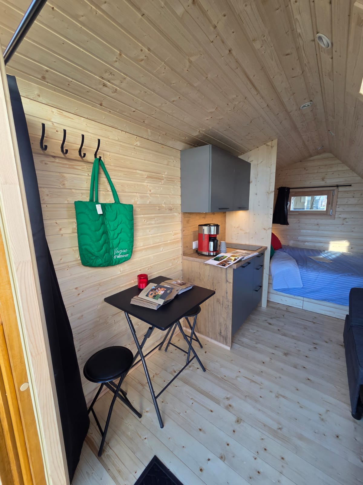Kitchenette simple avec frigo intégré et table + tabourets bois ou chaises pliantes