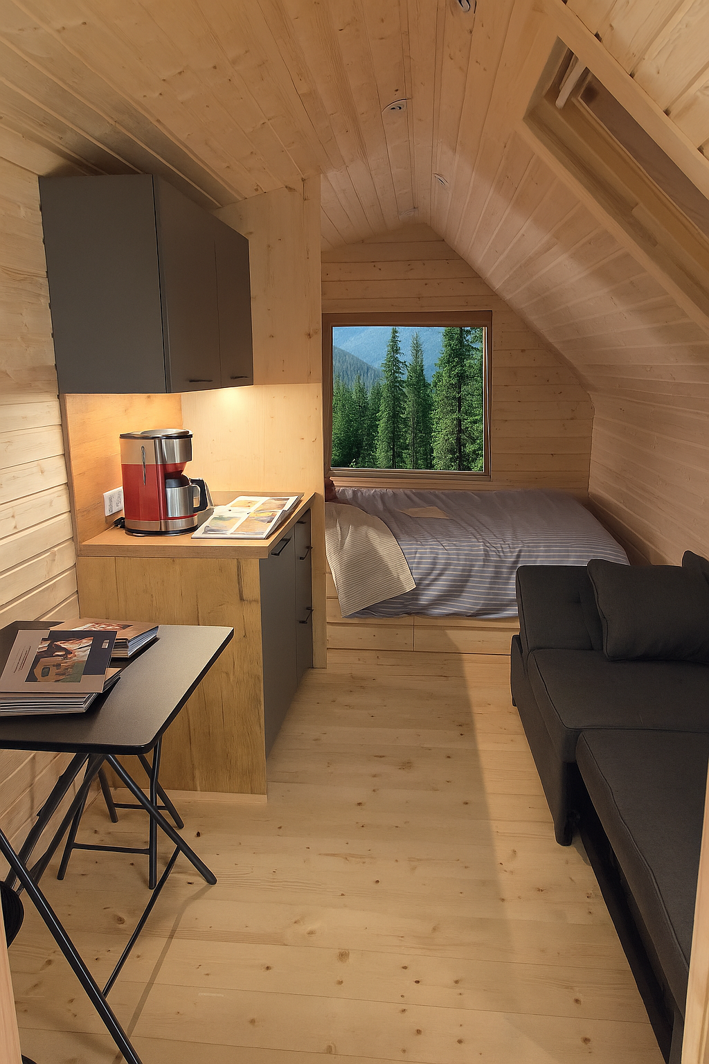 Ses grandes surfaces vitrées AVANT ET ARRIERE laissent entrer la lumière naturelle et ouvrent la vue sur la nature environnante, tandis que son aménagement intérieur allie confort moderne et authenticité.